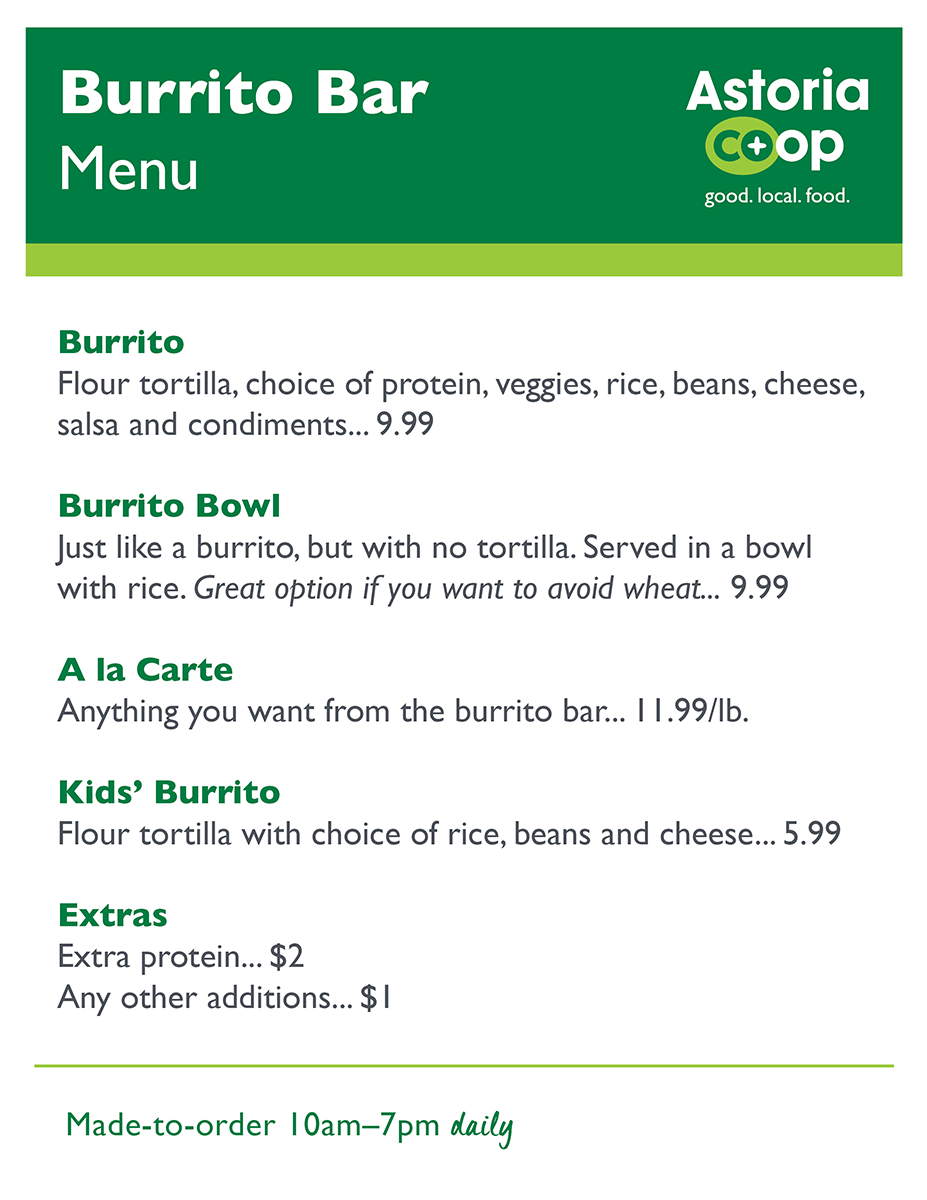We offer a burrito bar punch card! Buy 9 and get the 10th free. This applies to one burrito, one bowl or $10+ worth of ala carte. Pick up your order from the burrito bar – or a prepared burrito from the hot case – and then ask your cashier for a punch card at checkout.