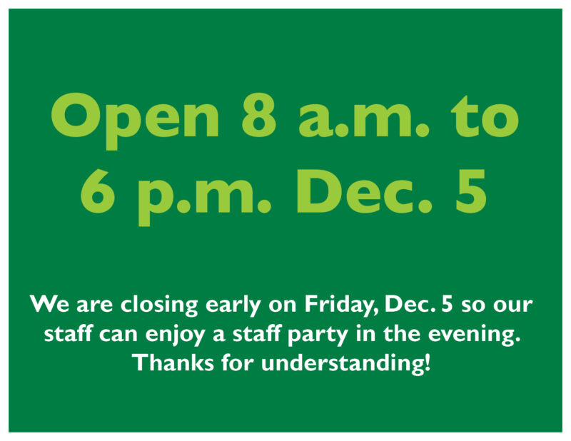 Your co-op is closing at 6 p.m. on Friday, Dec. 5 so we can celebrate our staff with a party in the evening! Thanks for understanding!