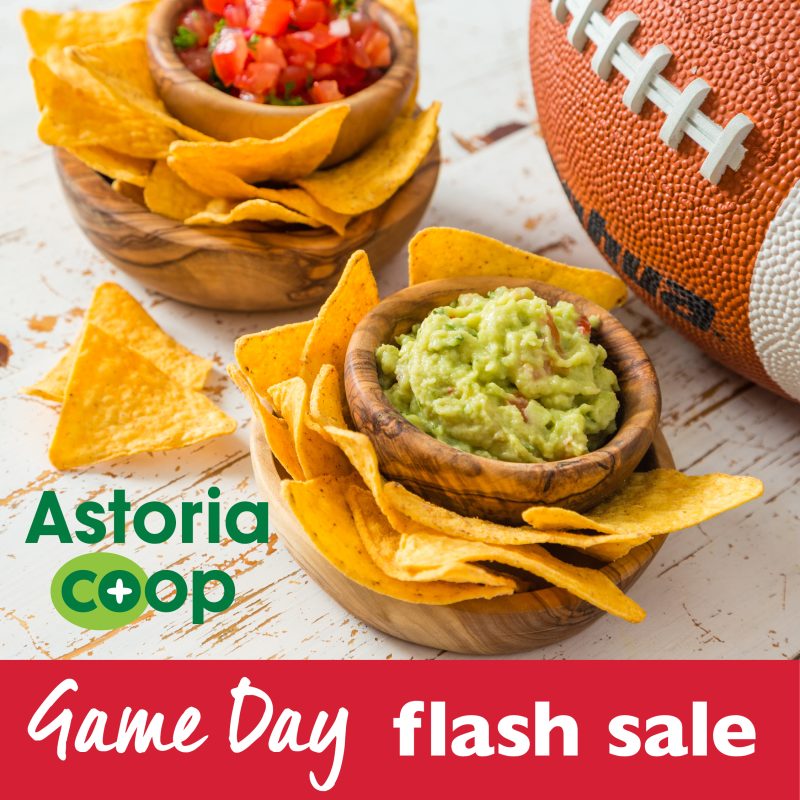 Game Day Sale, Feb. 6-8! Score great deals, including buy one, get one free sales on chips and hop water, half price deli guacamole, four avocados for three dollars and organic chicken wings for 4.99 per pound!