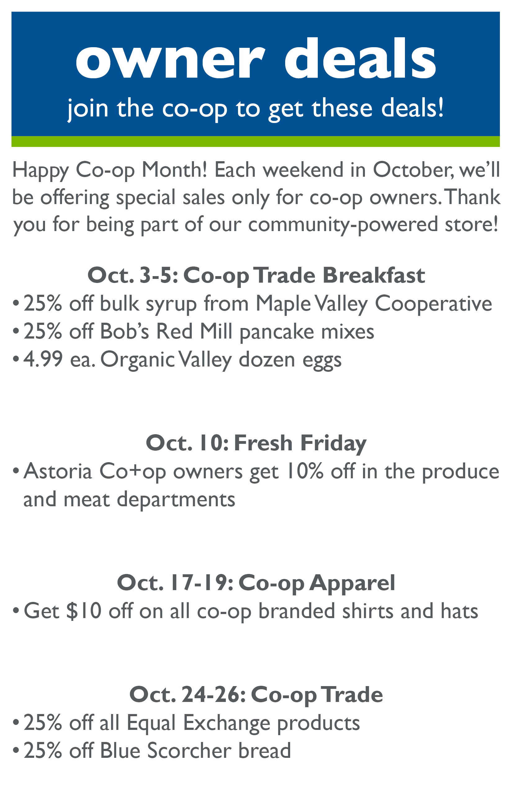 This Co-op Month, we are celebrating Astoria Co+op owners with special deals each weekend! Check out the schedule and plan your shopping lists. Not an owner yet? Come sign up during our Co-op Month Member Drive! Equity is only $25 per year and you receive a $20 coupon when you join. Plus, owners get
