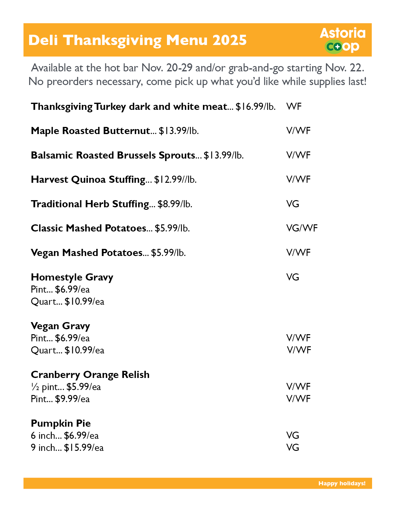 We’ll be closed on Thanksgiving Day, Nov. 27 — but open regular hours before and after the holiday! As your community owned grocery store, we’re especially thankful for your support this year. Every visit, every meal, every cartful helps sustain our co-op on the coast. Thank you!