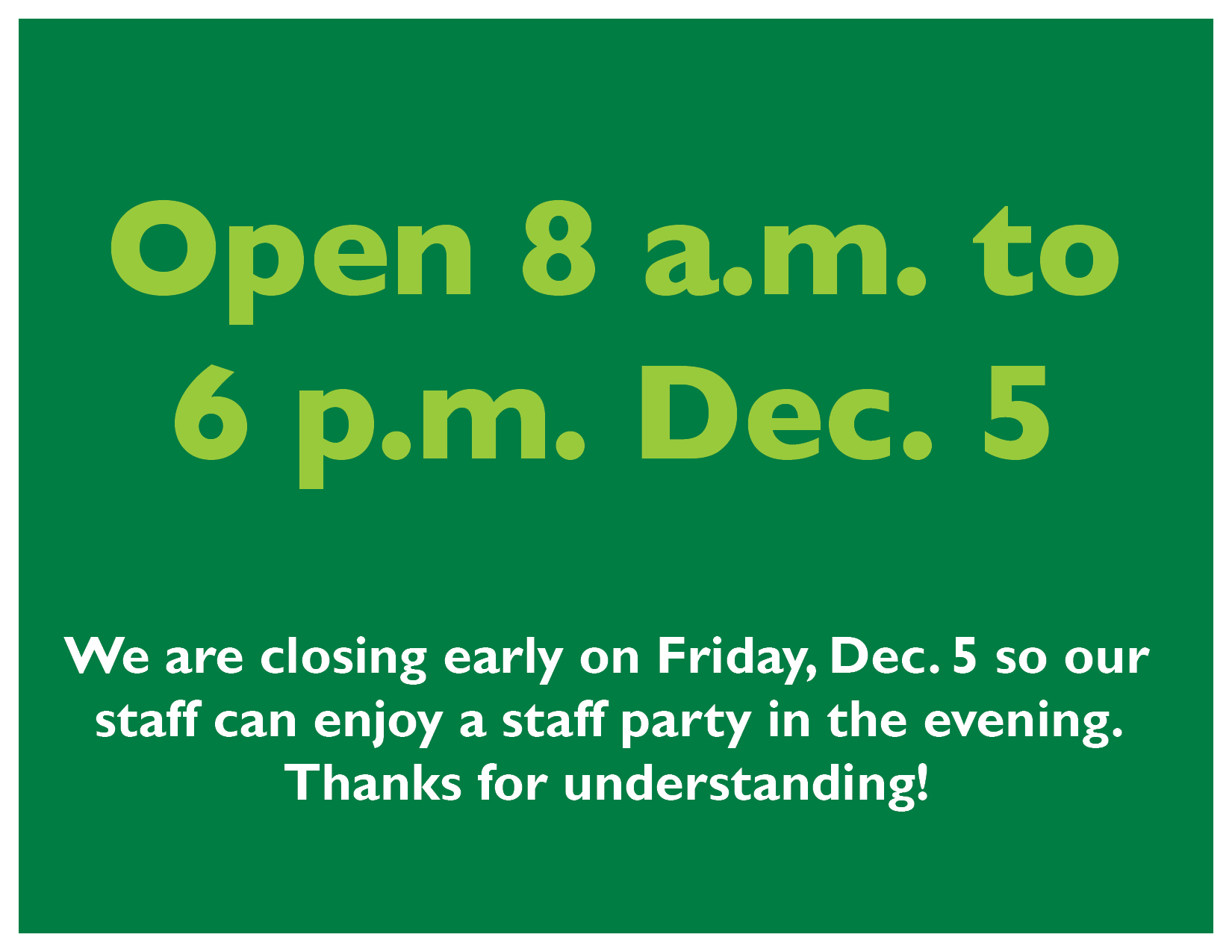 Your co-op is closing at 6 p.m. on Friday, Dec. 5 so we can celebrate our staff with a party in the evening! Thanks for understanding!