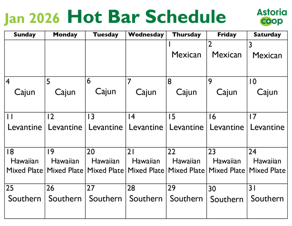 Our menu items change throughout the week and even throughout the day, but you can count on them matching the culinary theme! Come by the co-op to see what’s on the menu today, or call 503-325-0027.