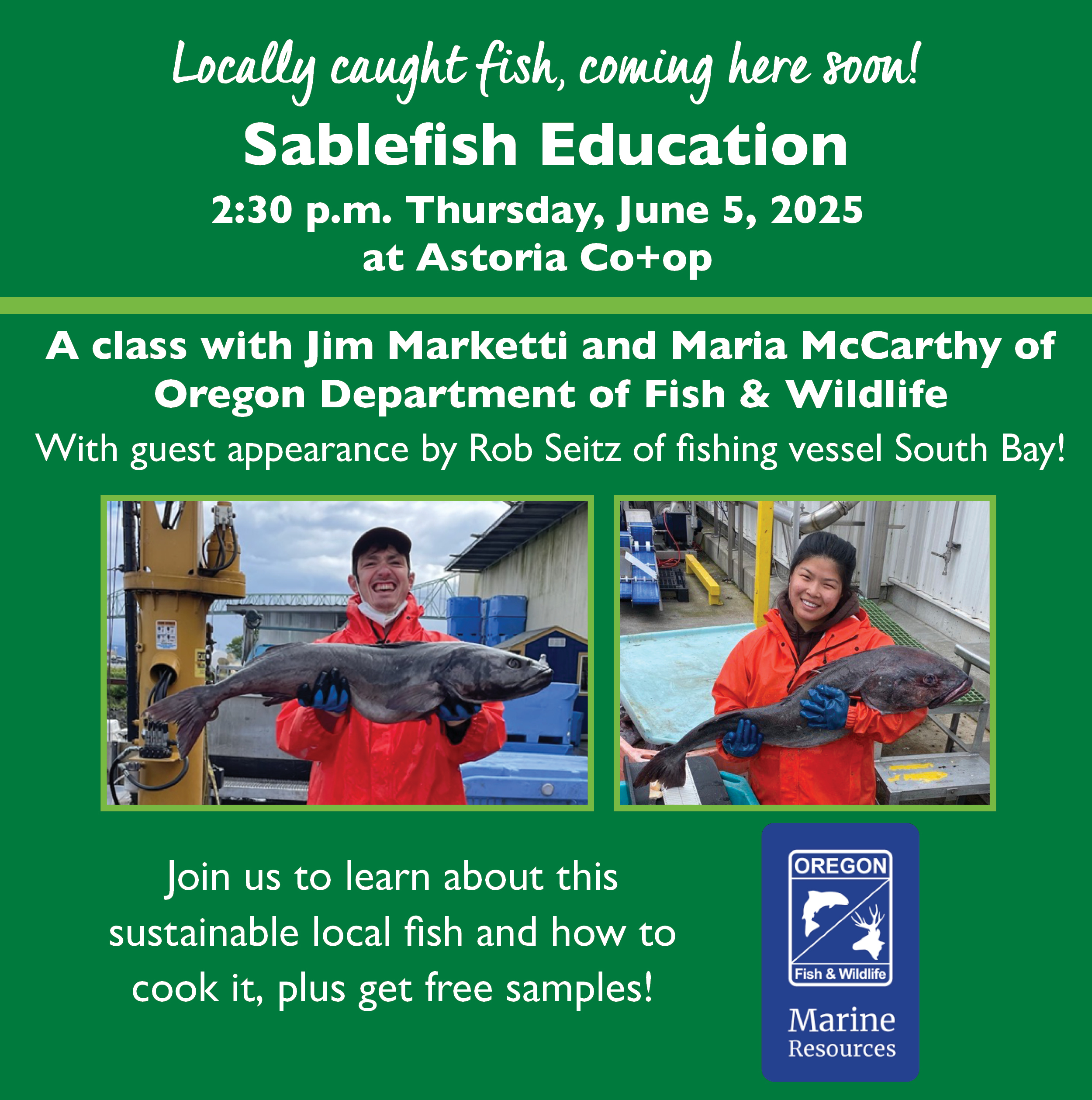 Save the date to celebrate sustainable sablefish! At 2:30 p.m. Thursday, June 5*, Jim Marketti and Maria McCarthy of ODFW will come to the co-op to teach us about this local fish, how it’s caught to minimize bycatch and how to cook it. Plus, get free samples! Local fisherman Rob Seitz also plans to make a guest appearance.