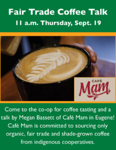 ![]() Join us at 11 a.m. Thursday, Sept. 19 for a coffee tasting and talk at the co-op! Megan Bassett of CafeĢ Mam in Eugene plans to give a ... Read more |